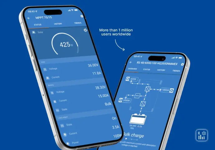 Utiliza la aplicación VictronConnect y otros softwares de la marca para configurar, monitorizar, actualizar y diagnosticar tu equipo Victron. Se puede conectar a los productos Victron a través de Bluetooth, USB y WiFi/LAN/Internet.